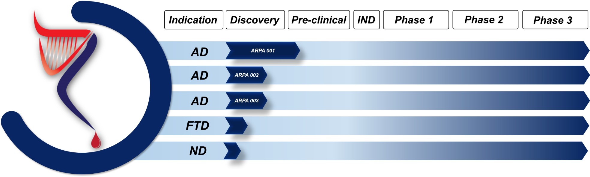 ARPA Bio's product portfolio consists of a novel monoclonal antibody molecule (ARPA001) with unique binding properties against early seeds of neurotoxic amyloid species. ARPA001 binding proptery distinguishes from earlier developed conformation specific or the clinical antibodies, since ARPA001 does not bind large, oligomeric or protofibrillar species but rather small molecular seeds prior to the appearance of oligomers. Our studies have shown, that these specific, early species are not detected by the current, clinical antibodies and therefore creates a loophole for early therapeutic or preventive intervention. Moreover, our lead antibody molecules do not bind non-toxic, amyloid-beta monomers, which is an additional, significant improvement when compared to earlier developed antibodies. Other antibodies (ARPA002 & ARPA003), with highly specific binding properties against different amyloid seeds serve currently as back-up molecules and will be subjected to future preclinical evaluation to maximize the therapeutic efficacy. (AD: Alzheimer, FTD: Frontotemporal Dementia, ND: not disclosed)