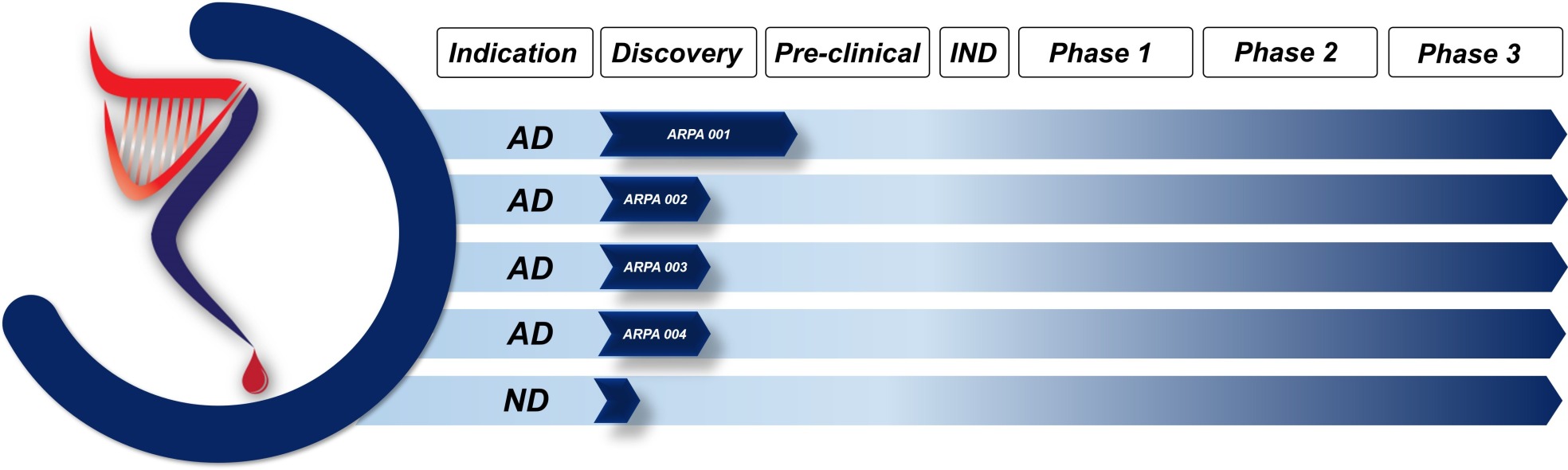 ARPA Bio's product portfolio consists of a novel monoclonal antibody molecule (ARPA001) with unique binding properties against early seeds of neurotoxic amyloid species. ARPA001 binding proptery distinguishes from earlier developed conformation specific or the clinical antibodies, since ARPA001 does not bind large, oligomeric or protofibrillar species but rather small molecular seeds prior to the appearance of oligomers. Our studies have shown, that these specific, early species are not detected by the current, clinical antibodies and therefore creates a loophole for early therapeutic or preventive intervention. Moreover, our lead antibody molecules do not bind non-toxic, amyloid-beta monomers, which is an additional, significant improvement when compared to earlier developed antibodies. Several other antibodies (ARPA002 - ARPA003), with highly specific binding properties against different amyloid seeds currently serve as back-up molecules and will be subjected to future preclinical evaluation to maximize the therapeutic efficacy. (AD: Alzheimer, ND: not disclosed)