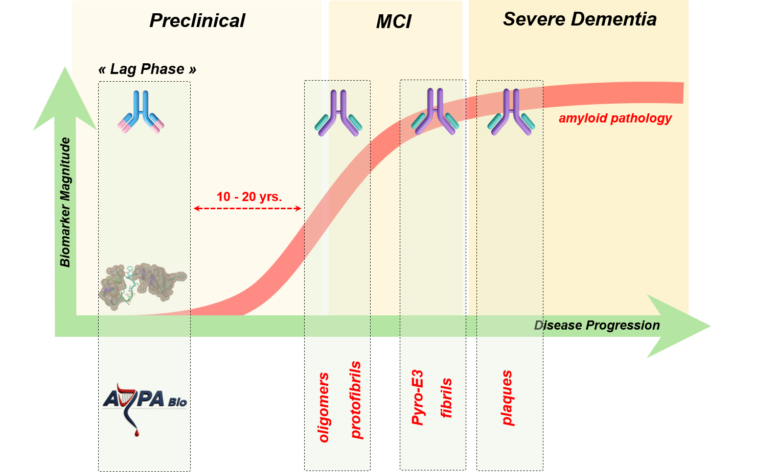 Simplified overview of ARPA Bio's therapeutic strategy using immuno-therapy to target early seeds of amyloid species during the long preclinical phase (lag phase 10-20 years) of the disease. (MCI: mild cognitive impairment)