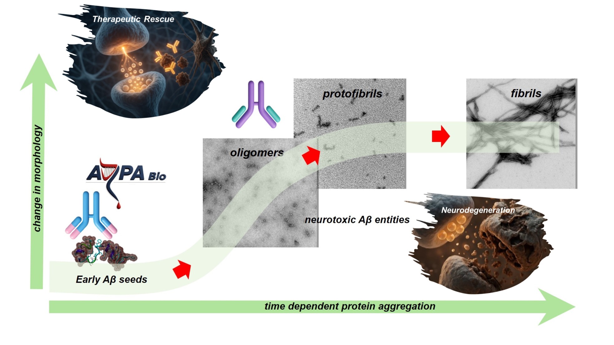 ARPA Bio uses several proprietary antibodies to target key molecular events (seeds) during early Aβ aggregation. This strategy places us at a unique position, enabling early diagnostics and therapeutic intervention, by targeting the root cause of the pathophysiology of the disease. Our therapeutic approach aims at selective targeting of early amyloid (Aβ) seeds and therefore inhibiting a time dependent formation of neurotoxic oligomers or protofibrils, which represent targets, of more advanced disease stages.